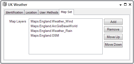 The Map Layers field also has four buttons, Add, Remove, Move Up and Move Down, which enable you to manage the Map Sources in the Map Set.