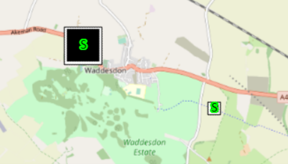 This example results in custom square Map Markers appearing on a map, overlaid with the marker text 'S'. One marker appears for each Advanced OPC Analog Point that exists in the database. The size of each Map Marker is determined by that particular point's current value (in the range 0-100). The marker position indicates the geographical location of the plant to which each point relates, specified on the relevant configuration Form's Location tab.