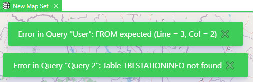 If the query that is used on a map contains invalid content, a popup diagnostic message is displayed on the map. The message indicates the issue that has been found in the query. The message remains on display for 5 seconds. You can remove the message from display sooner by selecting the Close button on the popup. The reason is also logged in the ViewX log file.