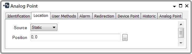 Use this option to enter the coordinates of a database item that is in a fixed location. For example, an outstation. When you select this option, Geo SCADA Expert displays the Position field.