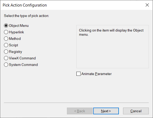 - Object Menu—The custom pick action provides access to the pick action options for an object in the database. If you have selected this option and have not enabled the Animate Parameter check box, proceed to step 5.
