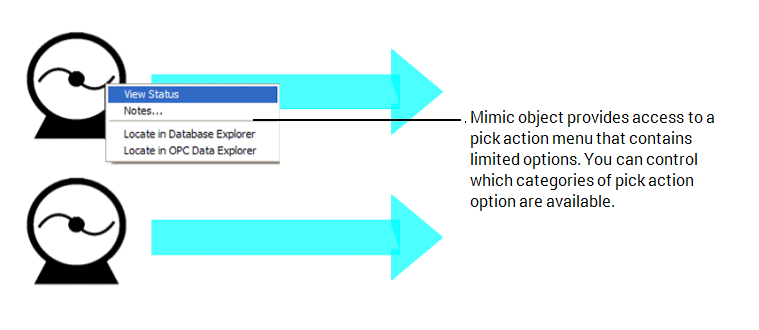 You can animate a Mimic object so that when it is selected in Run mode, a pick action menu that only contains selected actions is displayed. This is useful when you need a Mimic object to provide access to some, but not all, types of action for an object. For example, you may want a Mimic object to provide access to all of a point's pick actions except the Edit Properties action.