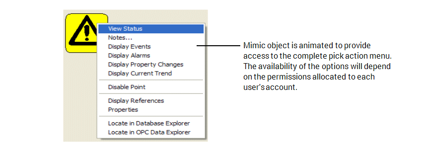 When you associate a pick action menu with a Mimic object, it contains each of the available pick actions by default (however, you can remove certain actions if required, see Animating an Object to Provide Access to Selected Actions Only).