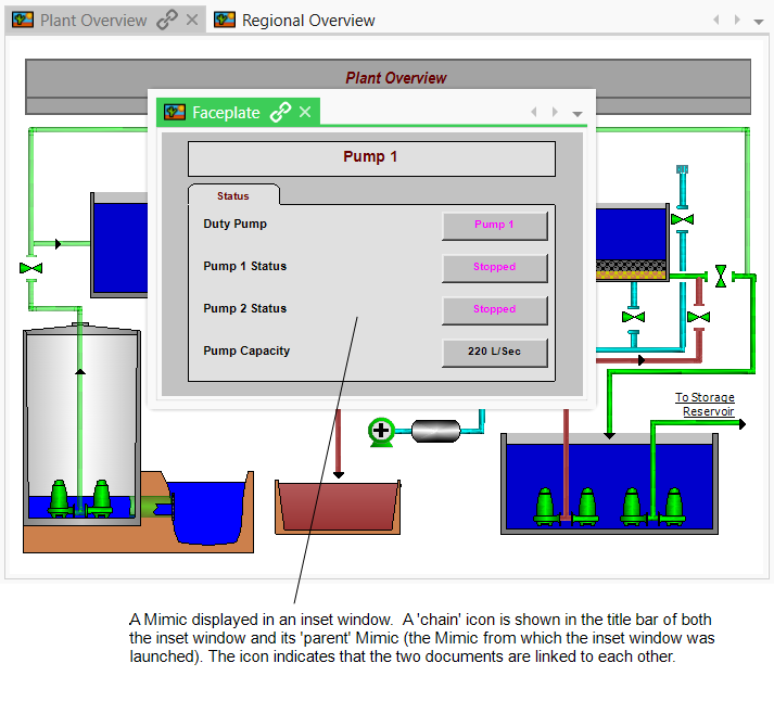 NOTE: If a document window displays a 'chain' icon , it indicates that it is associated with another document window. For example, an inset window maintains a relationship with the parent Mimic from which it was launched. While both of the associated document windows remain open, their title bars display a 'chain' icon. If you close the parent window, both document windows will close.