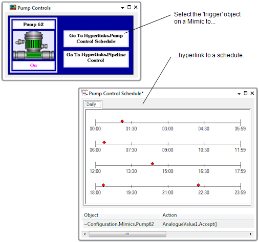 When the Mimic is displayed in Run Mode, selecting the 'trigger' object will cause the 'target' Schedule to be displayed in a new window or in place of the currently displayed Mimic (depending on the type of hyperlink you have configured).