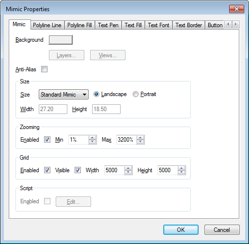 4. Use the Mimic Properties window to define the settings that will apply to every Mimic that is configured for the first time on your client PC. For more information on the settings on the Mimic Properties window, see Mimic Properties Window.