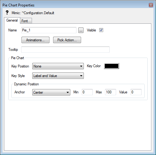 When you have added a pie chart to a Mimic, you can access its Pie Chart Properties window to edit its settings. To display the window, double-click on the object on the Mimic. (For other ways of displaying the window, see Display the Properties Window for an Object on a Mimic.)