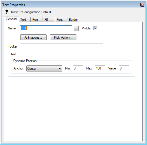 When you have added a text box to a Mimic, you can access its Text Properties window to edit its settings. To display the window, double-click on the object on the Mimic. (For other ways of displaying the window, see Display the Properties Window for an Object on a Mimic.)