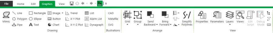 The Graphics tab appears on the ViewX ribbon when you display a Mimic in Design mode (see Designing a Mimic). The Graphics tab is only included on the ribbon while the editable Mimic is the active document window.