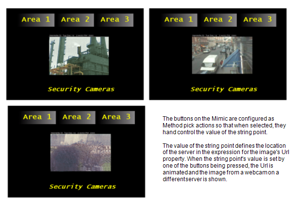 The Mimic also has three buttons (Area 1, Area 2, and Area 3). Each button is configured to work as a Method type of pick action so that when it is selected it hand controls the value of the string point. Each button hand controls the point so that its value is the IP address of the relevant server: