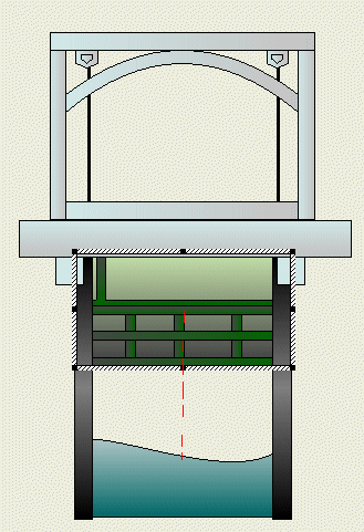 A Mimic contains a graphical representation of a weir that is used in the water industry. The weir is animated so that it is raised or lowered, depending on the value of an analog point (named ‘MDN River Level’).
