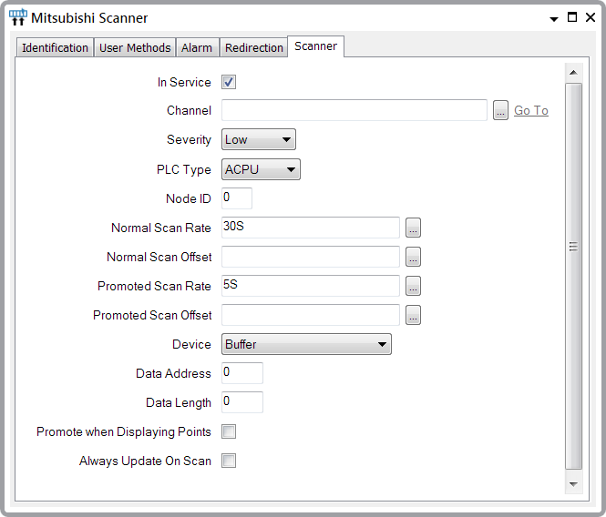 Use the fields on the Scanner tab of the Mitsubishi Scanner Form to define the general and Mitsubishi-specific properties for a scanner. Many of the fields on this tab are common to many scanners (see Configuring Scanners on Simple Drivers in the Geo SCADA Expert Guide to Simple Drivers). Those fields that are specific to scanners on the Mitsubishi driver are described below.
