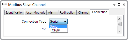 Use the Connection Type field on a Modbus Slave Channel’s Connection tab to specify the type of channel connection that is to be used.