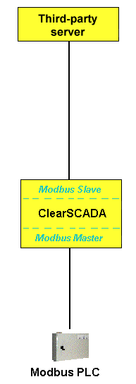 Where a third-party server uses the Modbus protocol to obtain data from Geo SCADA Expert, and Geo SCADA Expert uses the Modbus protocol to obtain its data from a PLC, Geo SCADA Expert becomes dual-purpose, with regard to Modbus functionality. When communicating with the third-party server, Geo SCADA Expert acts as a Modbus Slave, and when communicating with the PLC, Geo SCADA Expert acts as a Modbus Master.