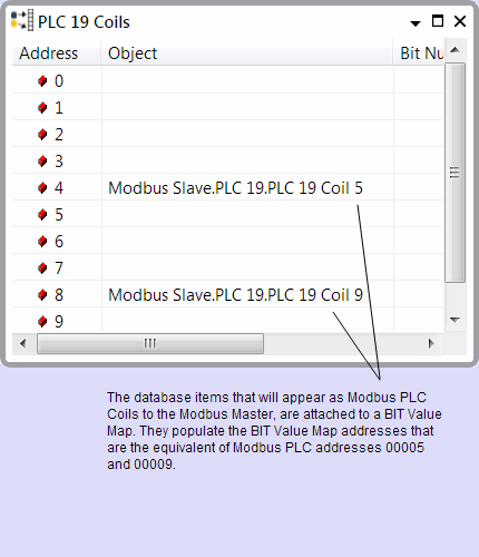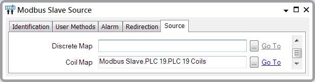 In order for the BIT Value Map to represent Coil data, the Value Map (named ‘PLC 19 Coils’) is specified at the Coil Map property on the Modbus Slave Source Form.