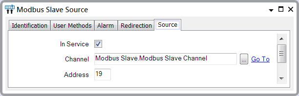 A Modbus Slave Source is configured to emulate a Modbus PLC and to use the above channel. In this particular example, the Source is assigned the Modbus address 19.