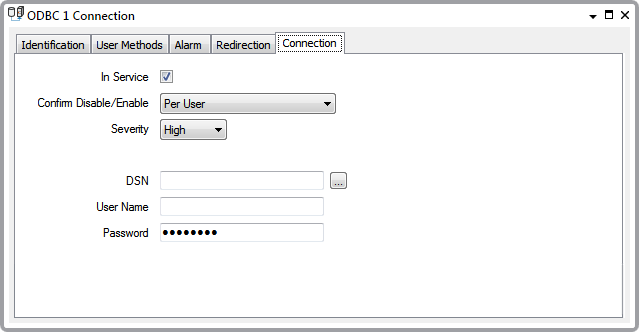 - In Service—Use to specify whether the ODBC connection is active or inactive (see Placing an Item In Service in the Geo SCADA Expert Guide to Core Configuration).
