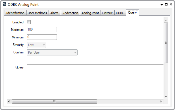 Select the Enabled check box if the point is to be used to update or insert values in another database. Use the Maximum, Minimum, Severity, and Confirm fields to define the properties of the control. The fields are often displayed on the Control tab of points on other drivers—for further information, see Define the Control Settings for an Analog Output Point in the Geo SCADA Expert Guide to Core Point Configuration.