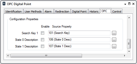 - Search Key 1—If your system has been configured to display an extra configuration field on each Point Form and that field has been set up using Search Key 1, you can use the Search Key 1 check box on the OPC Digital Point Form to specify whether to retrieve the value of the Search Key 1 field from the OPC data source.