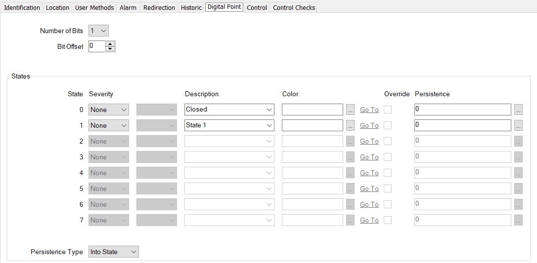 For information about the Persistence Type and Persistence duration fields, see Use Persistence to Stop Fleeting Changes in Value from Changing a Point State.