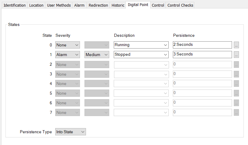 (If the Persistence Type was ‘Out of State’, when the point changed from ‘Running’ to ‘Stopped’, only two seconds would need to have elapsed before the value and state were recorded as having changed (as the Persistence duration for the state that was being left is specified as 2 seconds). Again, if the point value changed back at any time during the two-second persistence period, the fleeting change in value and state would not be recorded, as the point would be deemed not to have changed value.)