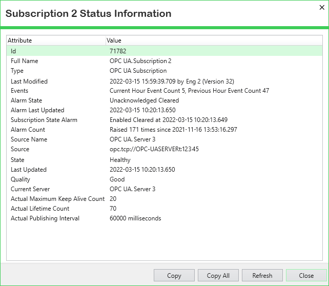 The Status display for each OPC UA Subscription item provides information about the present state of the individual subscription.