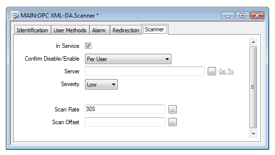 Use the fields on the Scanner tab to define the driver-specific properties of a scanner. Some of these fields are common to many scanners (see Configuring Scanners on Simple Drivers in the Geo SCADA Expert Guide to Simple Drivers). Those fields that are specific to scanners on the OPC XML-DA Client driver are described below.
