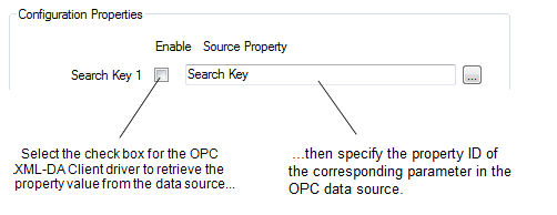- Select the corresponding check box if the OPC XML-DA Client driver is to retrieve the property value from the OPC data source. Specify the property ID in the adjacent field.
