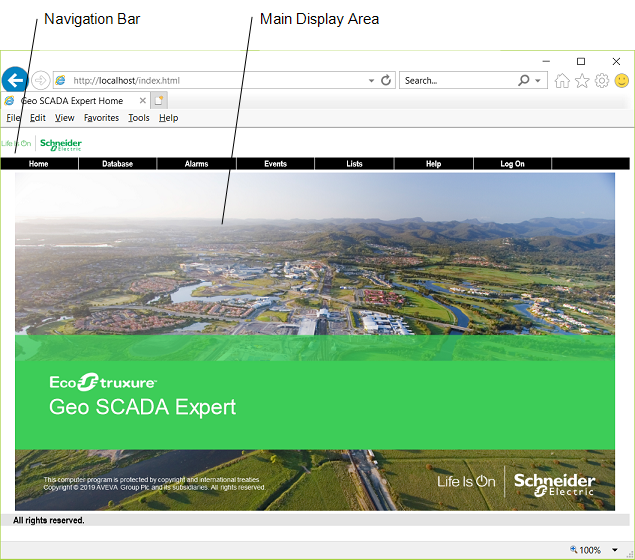 - Home—Select this button to display your Geo SCADA Expert home page. This is equivalent to the Home command on the ViewX ribbon's Home Tab.