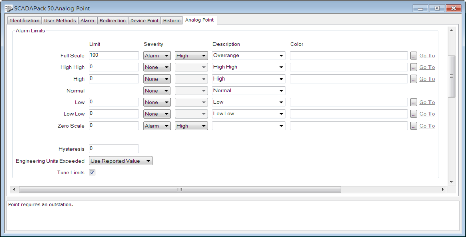 Use the fields within the Alarm Limits section of the Analog Point tab to set alarm limits for a point and to specify whether Geo SCADA Expert generates an alarm or event if the point exceeds those limits.