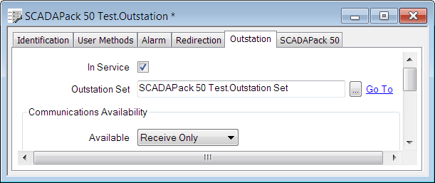 - Configure the SCADAPack 50 Test.Outstation properties. This includes allocating the outstation to an Outstation Set, which is a group of outstations that share channels