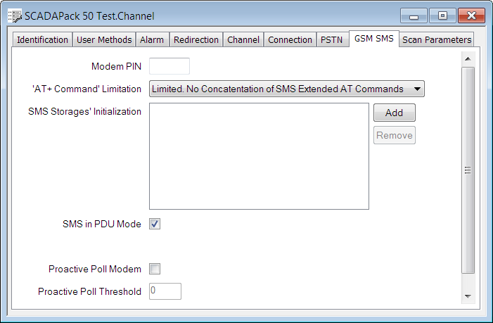 - Check that any commands in the SMS Storages' Initialization field are compatible with the SMS in PDU Mode setting on the GSM SMS tab. The specification of some SMS AT commands differs depending on whether the channel is in SMS Text mode or is in SMS PDU mode (for more information, see the modem manufacturer's documentation).