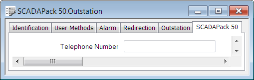 Use the Telephone Number property on the SCADAPack 50 tab to specify the telephone number of the device modem. Geo SCADA Expert can potentially receive messages from many devices. The Telephone Number and Outstation Name together identify to Geo SCADA Expert which device this is (see Specify an Outstation Name).