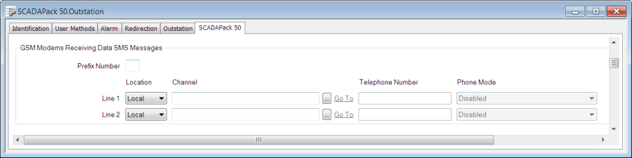 - Location Line n—Specify the destination to which the device should send SMS messages. This will be a local Geo SCADA Expert channel and/or a remote telephone number. You can specify up to two destinations (Line 1 and Line 2). However, only one destination should be to a local Geo SCADA Expert channel, to avoid duplication of SMS messages in Geo SCADA Expert.