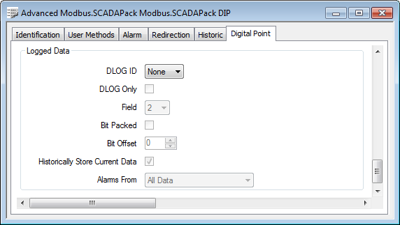 Use the fields within the Logged Data section of the Digital Point tab to specify how the Geo SCADA Expert server processes the data that it receives from a controller, specifically when the server raises and clears point alarms.