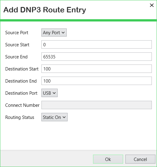 • Static Off—The route is disabled. If the SCADAPack x70 device receives DNP3 frames that match this route entry, it will not forward those frames. The SCADAPack x70 device will not update the Connect Number.