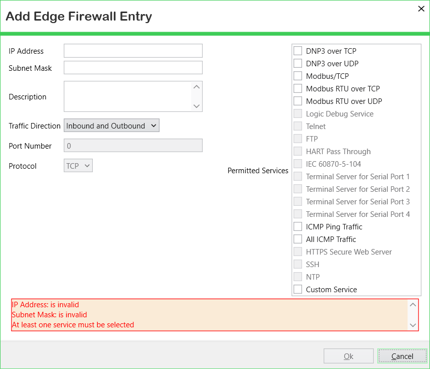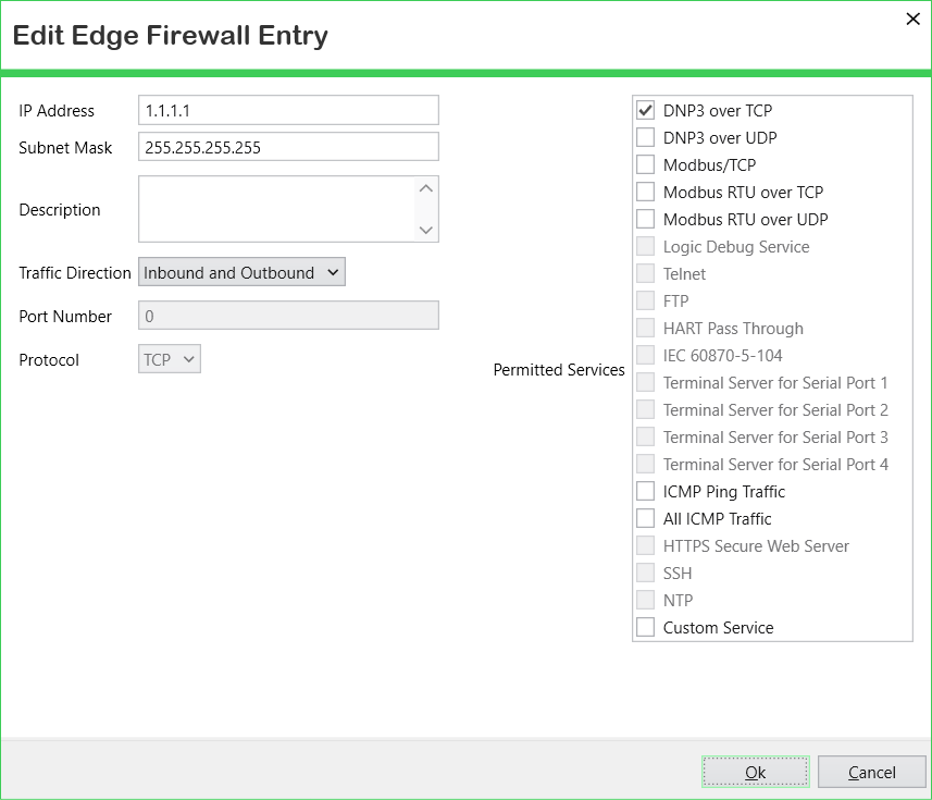 You use a SCADAPack x70 Edge Firewall Table to specify the addresses and services from which a particular SCADAPack x70 device is to accept inward network traffic, when that SCADAPack x70 device connects to the Edge Applications platform under Linux (see Port Function - Edge). When the Edge Firewall is enabled (see above), only network traffic that is transmitted from addresses and services that are included in the Edge Firewall Table is accepted; network traffic that is transmitted from addresses and services that are not included in the Edge Firewall Table is ignored.