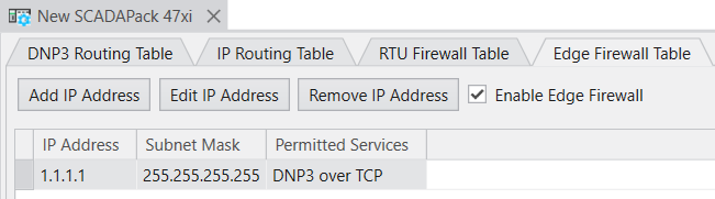 - Use the Enable Edge Firewall check box on the Edge Firewall Table tab on the SCADAPack x70 Device Configuration item's tables.