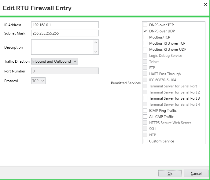 You use a SCADAPack x70 RTU Firewall Table to specify the addresses and services from which a particular SCADAPack x70 device is to accept inward network traffic. When the RTU Firewall is enabled (see above), only network traffic that is transmitted from addresses and services that are included in the RTU Firewall Table is accepted; network traffic that is transmitted from addresses and services that are not included in the RTU Firewall Table is ignored.