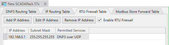 - Use the Enable RTU Firewall check box on the RTU Firewall Table tab on the SCADAPack x70 Device Configuration item's tables.