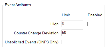 - Unsolicited Events (DNP3 Only)—Use this check box to specify whether the DNP3 Outstation spontaneously reports events to the DNP3 Controlling Station when the Counter High Limit is exceeded or the Counter Change Deviation is exceeded.