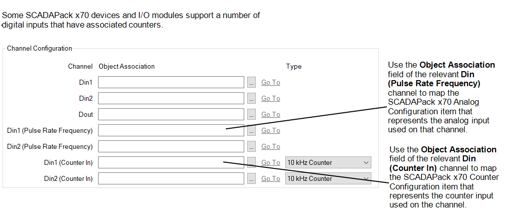 The Channel Configuration section includes a Din (Counter In) Channel entry for each digital input channel that can have an associated counter (see Specify the Required Counter Input Type). To use the counter input on such a channel, you use the channel's Object Association field to specify the SCADAPack x70 Counter Configuration item that represents the counter input on that channel.