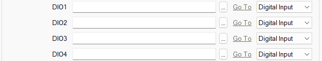 Some I/O modules have a number of digital channels that you can configure as digital input or digital output channels. Such channels are labelled 'DIO' channels. You use the combo box that is next to each DIO channel to specify whether the channel is a Digital Input channel, or a Digital Output channel. The default is Digital Input.