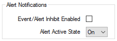 - Alert Active State—Use the combo box to specify which of the item's states is considered to be an alert condition. Choose from On and Off. The default is On. An alert condition is indicated in the SCADAPack x70 Digital Configuration item's point quality within the SCADAPack x70 device (via ALERT_STATE_QUAL flag).