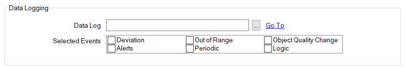 The SCADAPack x70 tab on the Forms of SCADAPack x70 Analog Configuration items contains a Data Logging section. Use the section to specify the data log and the required events that are to be logged for the SCADAPack x70 Analog Configuration item. The properties in the section are only available for use if the SCADAPack x70 Device Configuration item with which the Analog Configuration item is associated has Data Logging enabled (see Configure the Device Options).