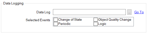 The SCADAPack x70 tab on the Forms of SCADAPack x70 Digital Configuration items contains a Data Logging section. Use the section to specify the data log and the required events that are to be logged for the SCADAPack x70 Digital Configuration item. The properties in the section are only available for use if the SCADAPack x70 Device Configuration item with which the Digital Configuration item is associated has Data Logging enabled (see Configure the Device Options).