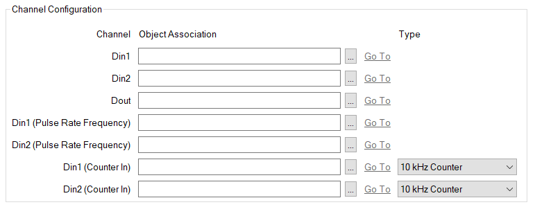 To use a digital input that provides counter input capabilities, you use the Object Association field that is associated with the relevant Din (Counter In) channel to specify the SCADAPack x70 Counter Configuration item that represents the counter input on that channel. To do this, select the browse button that is next to the Object Association field that represents the relevant I/O channel. This displays a Reference browse window from which you select the required SCADAPack x70 Configuration item.