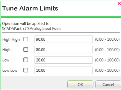 To remove any tuning, from the SCADAPack x70 protocol-specific point, select the Tune Alarm Limits pick action to display the Tune Alarm Limits window and clear the check boxes. An entry will be logged in the Event Journal, stating that the alarm limits have been returned to their configured defaults.