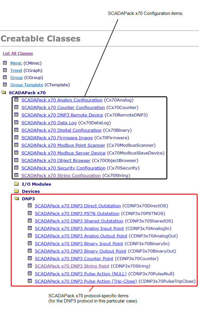 - The classes for SCADAPack x70 Device Configuration items derive from a Cx70Outstation base class. The Methods section for that base class contains driver-specific methods that are associated with configuration that can exist in the SCADAPack x70 device itself.