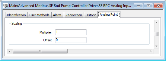Use the fields within the Scaling section of the Analog Point tab to configure a point’s scaling. The SE RPC driver applies to scaling to each value that it retrieves from the controller, before passing the resultant value to the Geo SCADA Expert database.